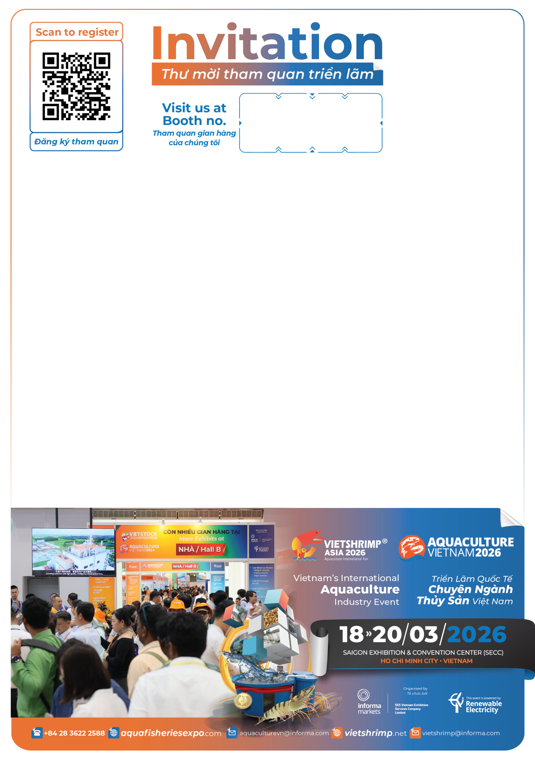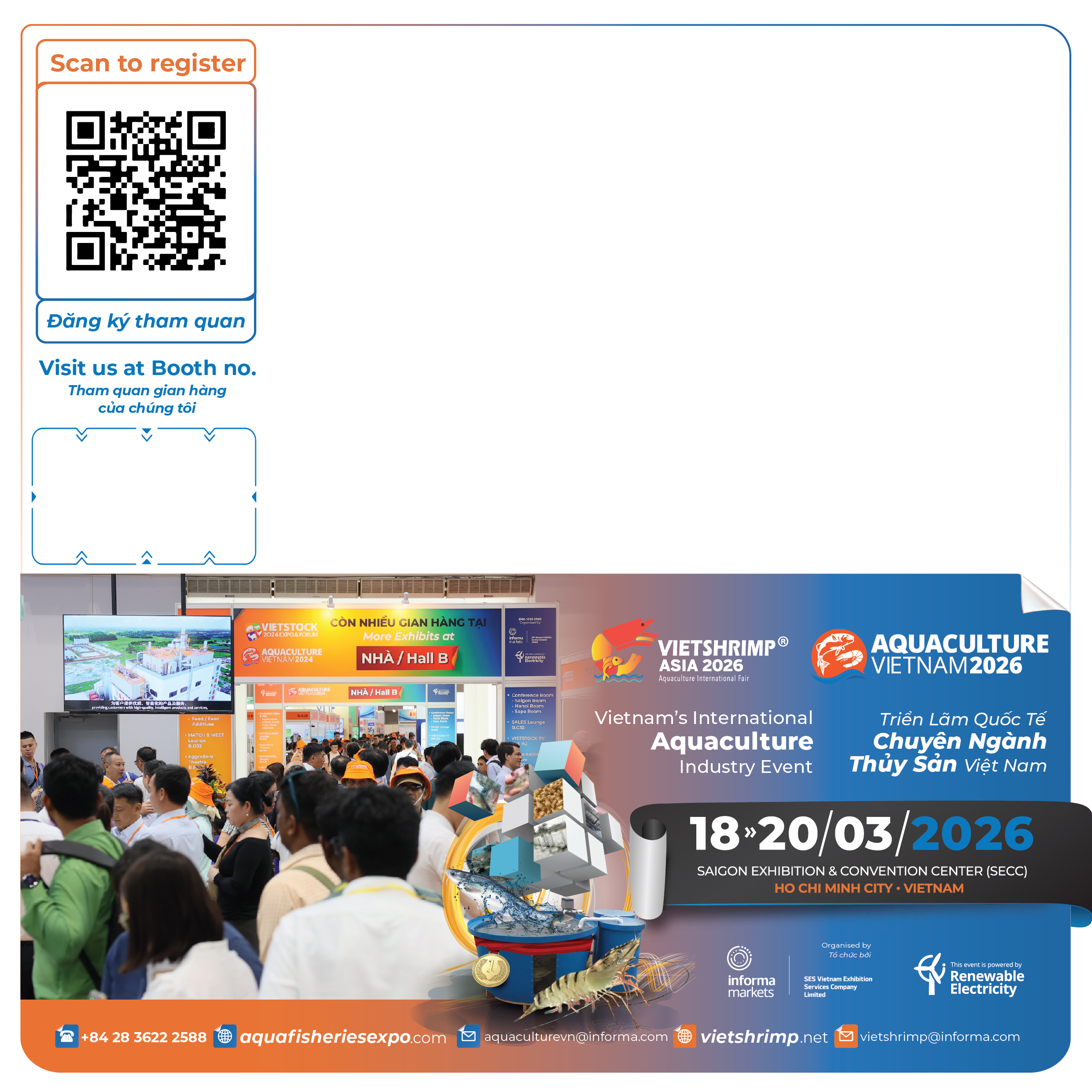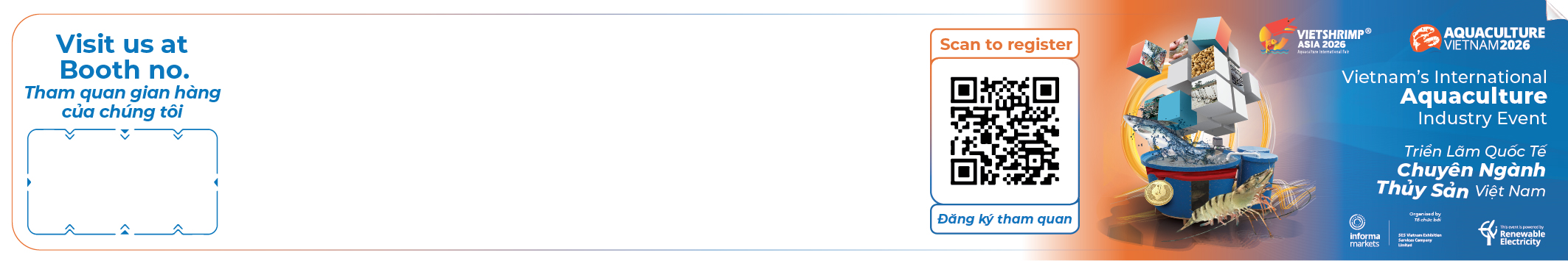 This kit is designed in harmony with VietShrimp Asia and Aquaculture Vietnam visual identity, helping to enhance professionalism and attract attention from visitors and potential partners. Exhibitors simply update their brand and booth information in the provided templates for quick and effective use.